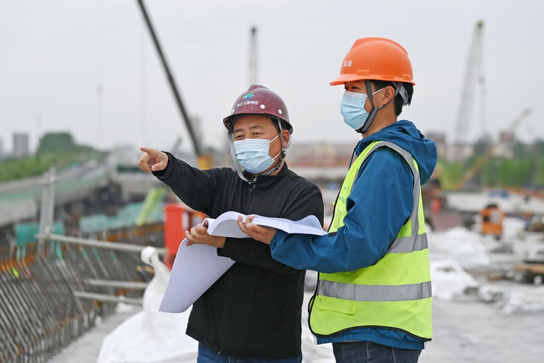 机器轰鸣、钢架林立、塔吊耸立,5月1日,在北京路快速化改造工程跨京杭运河特大桥施工现场,建设工人戴着口罩不停穿梭于道路开挖、管道铺设、桥梁架构等各个作业面,北京路快速化改造工程项目管理组组长朱宝广与技术员认真核对图纸,反复商讨下一阶段施工方案。
