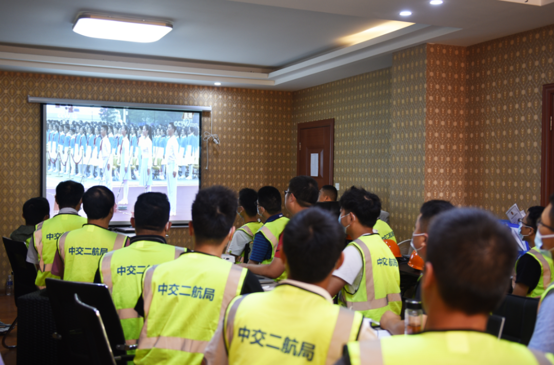 ▲北京路快速化改造工程项目部人员收看大会现场直播