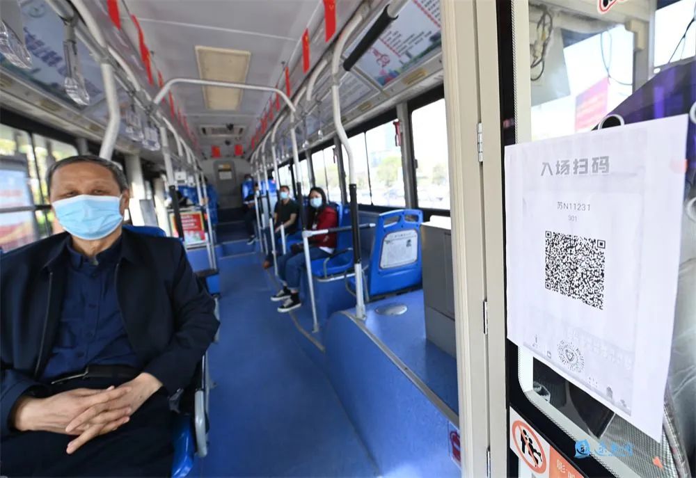 4月11日早上,在宿迁市区洪泽湖路上,301路公交车准点驶入宿迁日报社站点,市民通过“宿康宝”扫场所码乘车。当日,市区恢复运营52路、53路、62路、81路、92路、108路、109路、K202路、301路、302路、303路、304路公交线路,线路运营时间从早上7点到晚上19点,班车间隔20-30分钟。