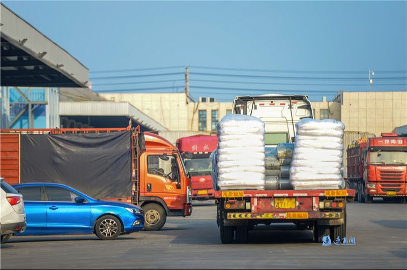 近日,宿迁经开区江苏通湖物流园内,工作人员正在有序作业,运输车辆来回穿梭,一派繁忙景象。