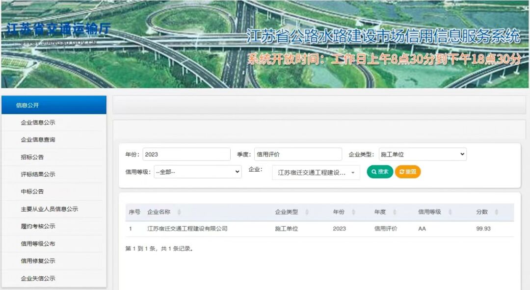 近日,江苏省交通运输厅公布《2023年度公路水运建设市场从业单位信用评定结果》,宿迁交建成功获评AA级,这也是连续四年获此殊荣。