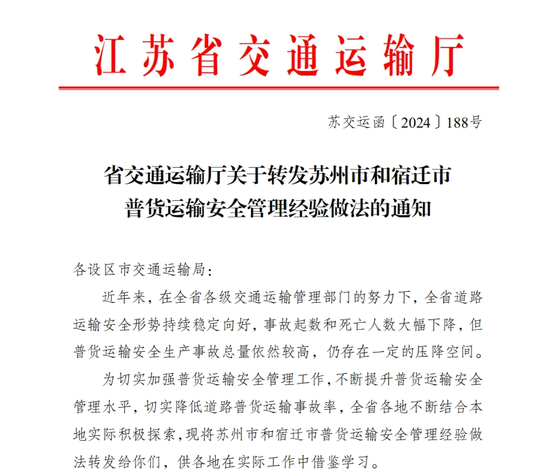 为切实加强普货运输安全管理工作,不断提升普货运输安全管理水平,切实降低道路普货运输事故率,近日,省交通运输厅将通湖物流园普货运输安全管理经验做法在全省范围内发文推广,供各地在实际工作中借鉴学习。