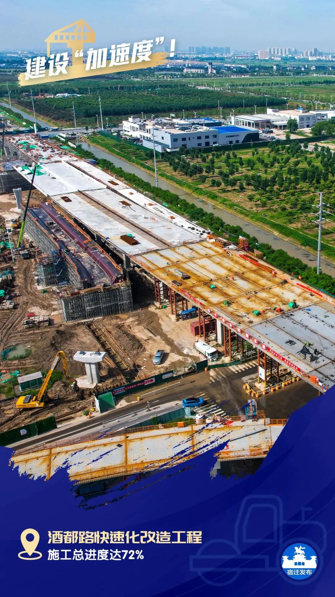 酒都路快速化改造工程南起北京路互通,北至宿迁大道南侧,道路全长5.6公里。主线为城市快速路,设计速度80公里/小时,双向6—8车道。辅路为城市主干路,设计速度50公里/小时,双向4—6车道。