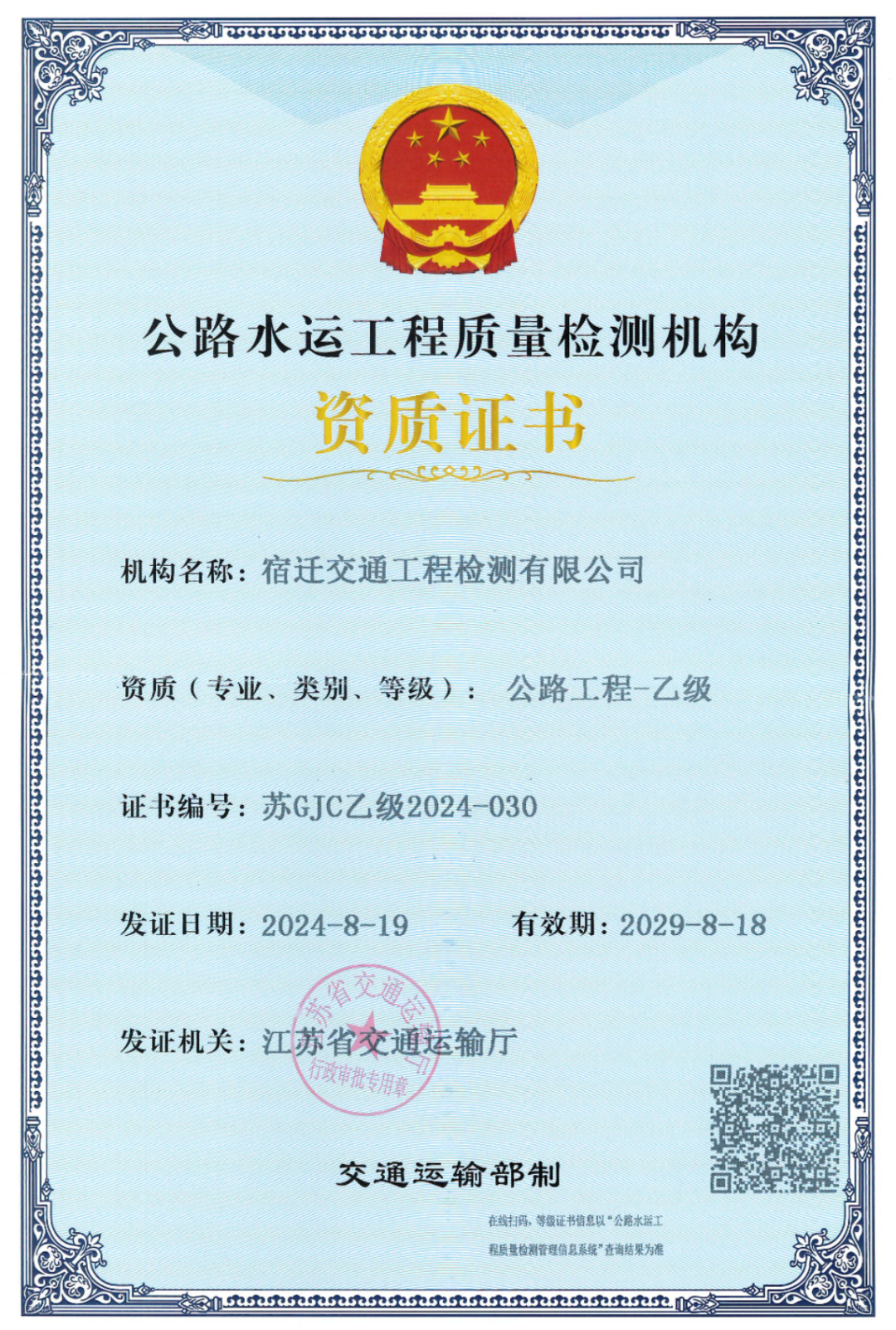【宿迁交建】宿迁交建检测公司顺利通过公路工程综合乙级资质延续审批