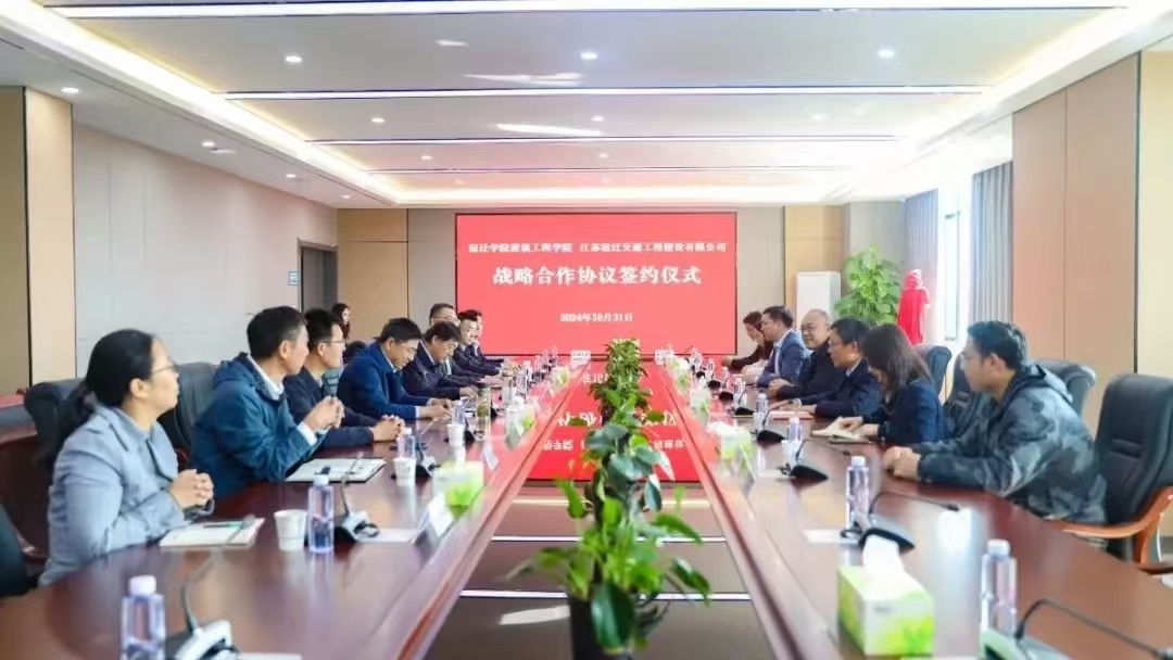 10月31日,宿迁交建与宿迁学院建筑工程学院签署战略合作协议,并举行“交通基础设施低碳材料与智能建造工程研究中心”揭牌仪式。学院党委书记郭振宇、院长朱方之,宿迁交通集团副总经理黄雪林出席活动。
