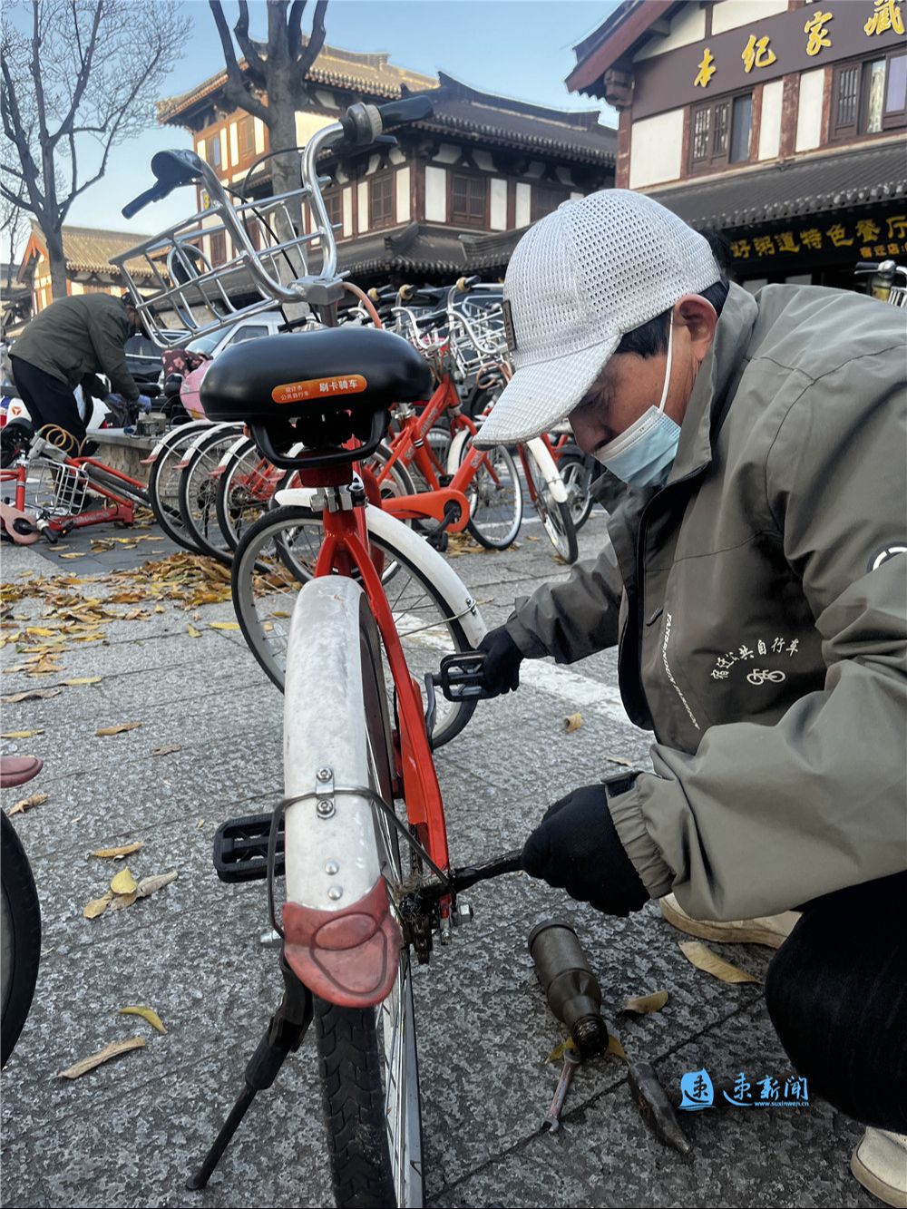 “这辆车的坐垫和车链都有问题,都要换新的。”11月29日上午,在市区项王故里景区附近的一个公共自行车站点,交通科技的工作人员正在为公共自行车进行保养、维修。