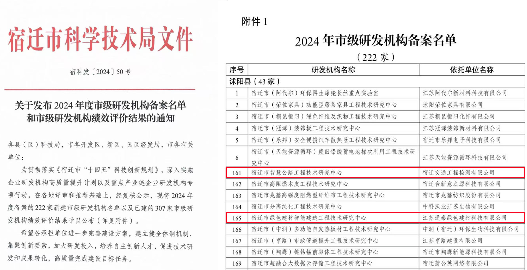 近日,宿迁市科学技术局发布通知,其中,宿迁交建所属企业宿迁交通工程检测有限公司申报的“宿迁市智慧公路工程技术研究中心”、江苏通泰绿色建材科技有限公司申报的“宿迁市绿色建材智能建造工程技术研究中心”被认定为市级研发机构。