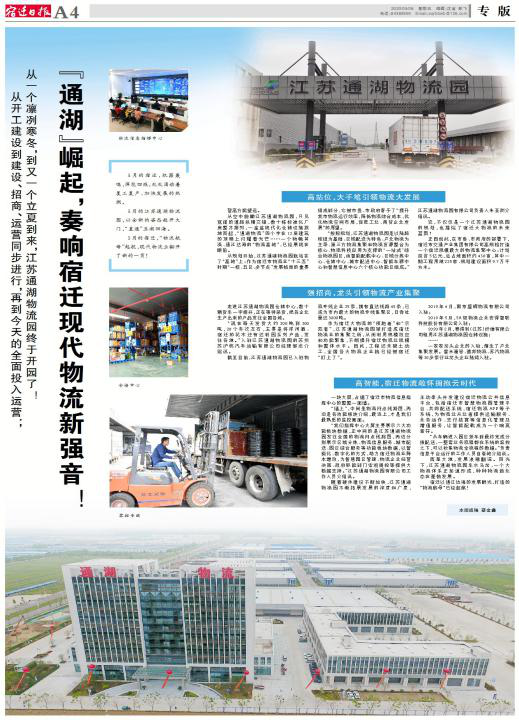 江苏通湖物流园位于325省道南侧、通湖大道西侧,总投资约5亿元,是我市“十三五”时期“一核、五区、多节点”现代物流体系的重要组成部分,也是市现代服务业重点项目。目前,线下的园区一期项目中综合服务中心、区域分拣中心、仓储保管中心、城市配送中心、智能车源中心和智慧信息中心六大功能版块已全部投入运营;线上的宿迁市公共物流信息平台已上线运营,为促进我市“大物流”信息系统建设奠定了坚实基础。