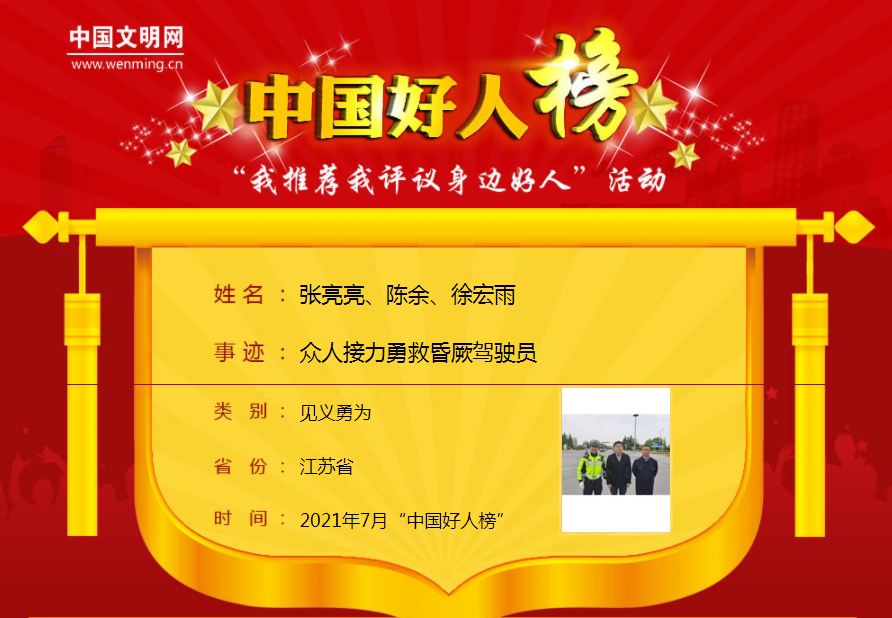 近日,中央文明办发布2021年7月“中国好人榜”,其中,宿迁交通集团徐宏雨入选见义勇为“中国好人”。