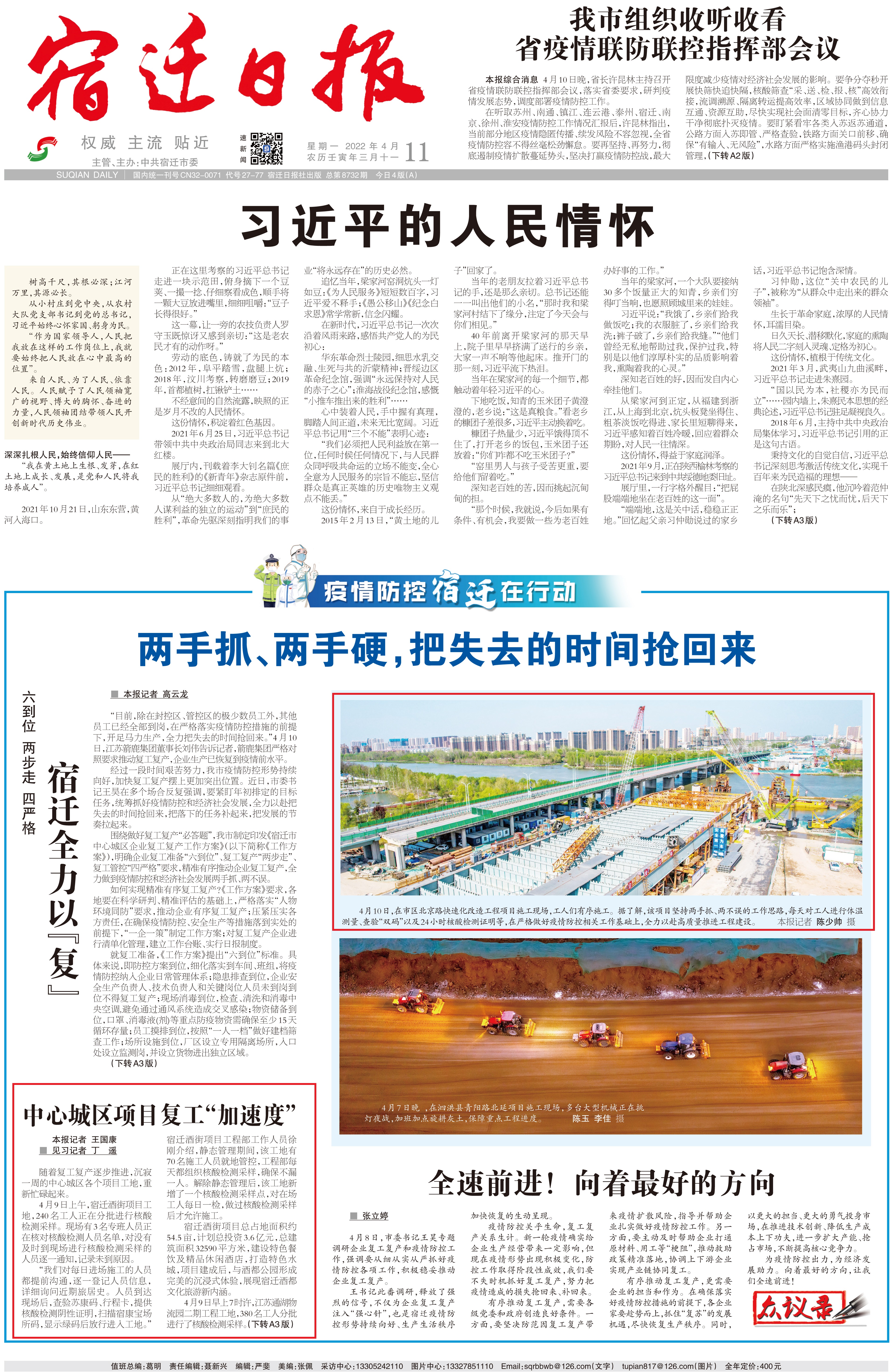 4月11日,《宿迁日报》头版《疫情防控宿迁在行动》专栏聚焦宿迁交通集团重点工程项目复工复产情况。报道如下: