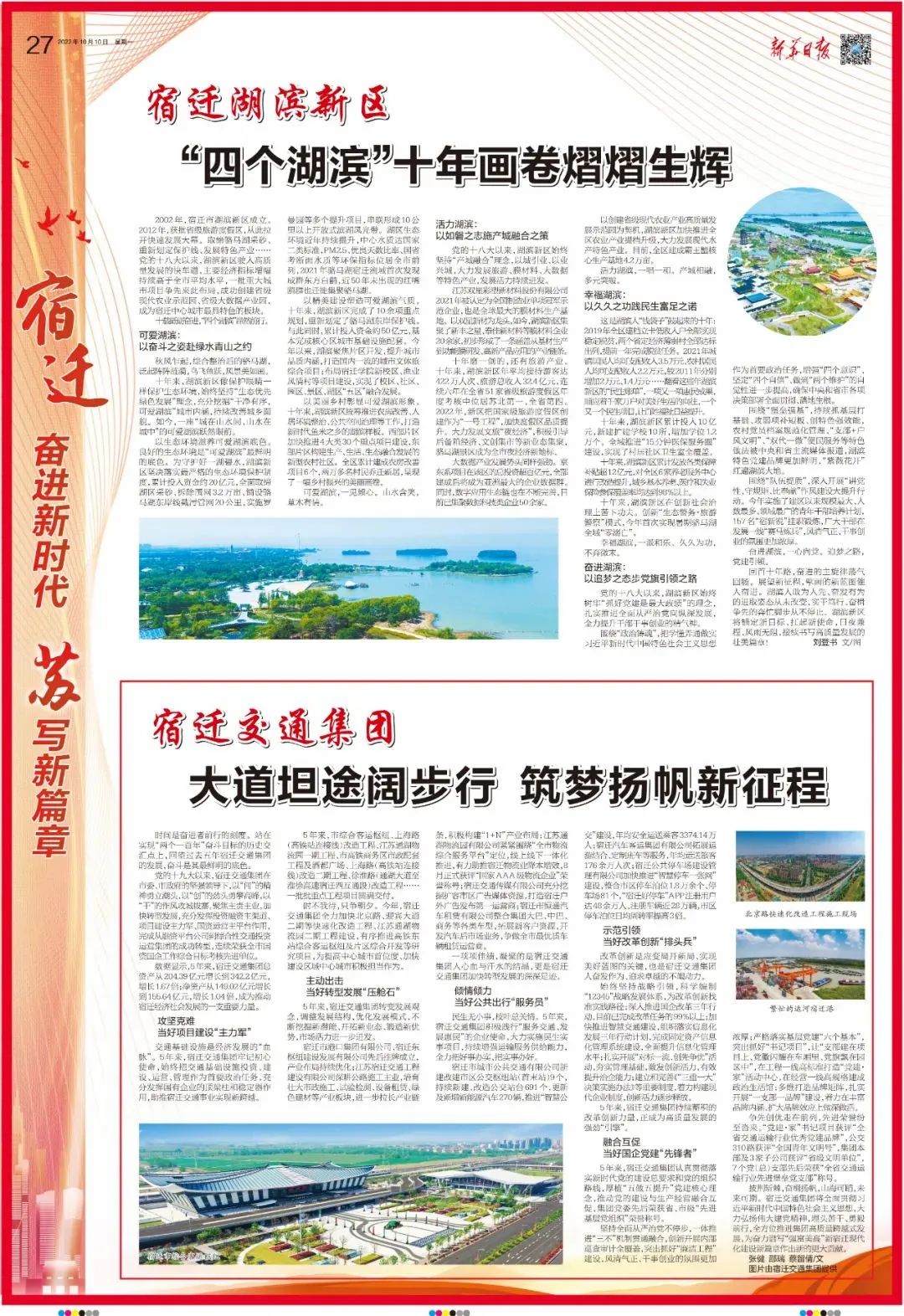 10月10日,《新华日报》以《宿迁交通集团:大道坦途阔步行 筑梦扬帆新征程》为题,报道了集团过去五年从融资平台公司到综合性交通投资运营集团成功转型的发展历程。