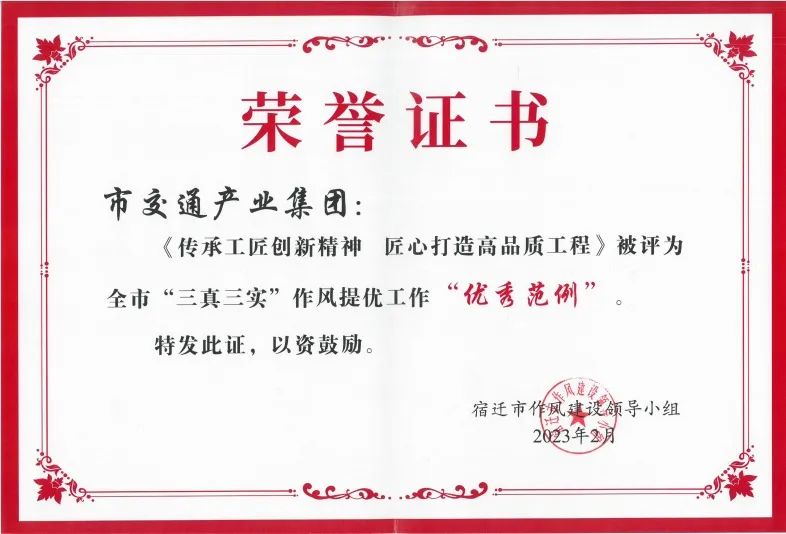 04 市作风建设领导小组办公室发布通报,宿迁交通集团《传承工匠创新精神 匠心打造高品质工程》获评全市“三真三实”作风提优工作“优秀范例”。