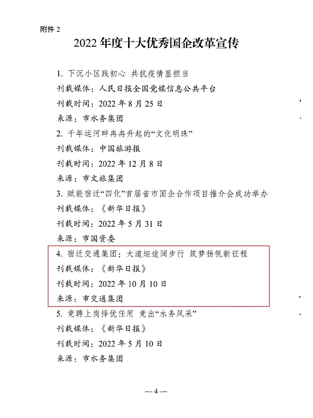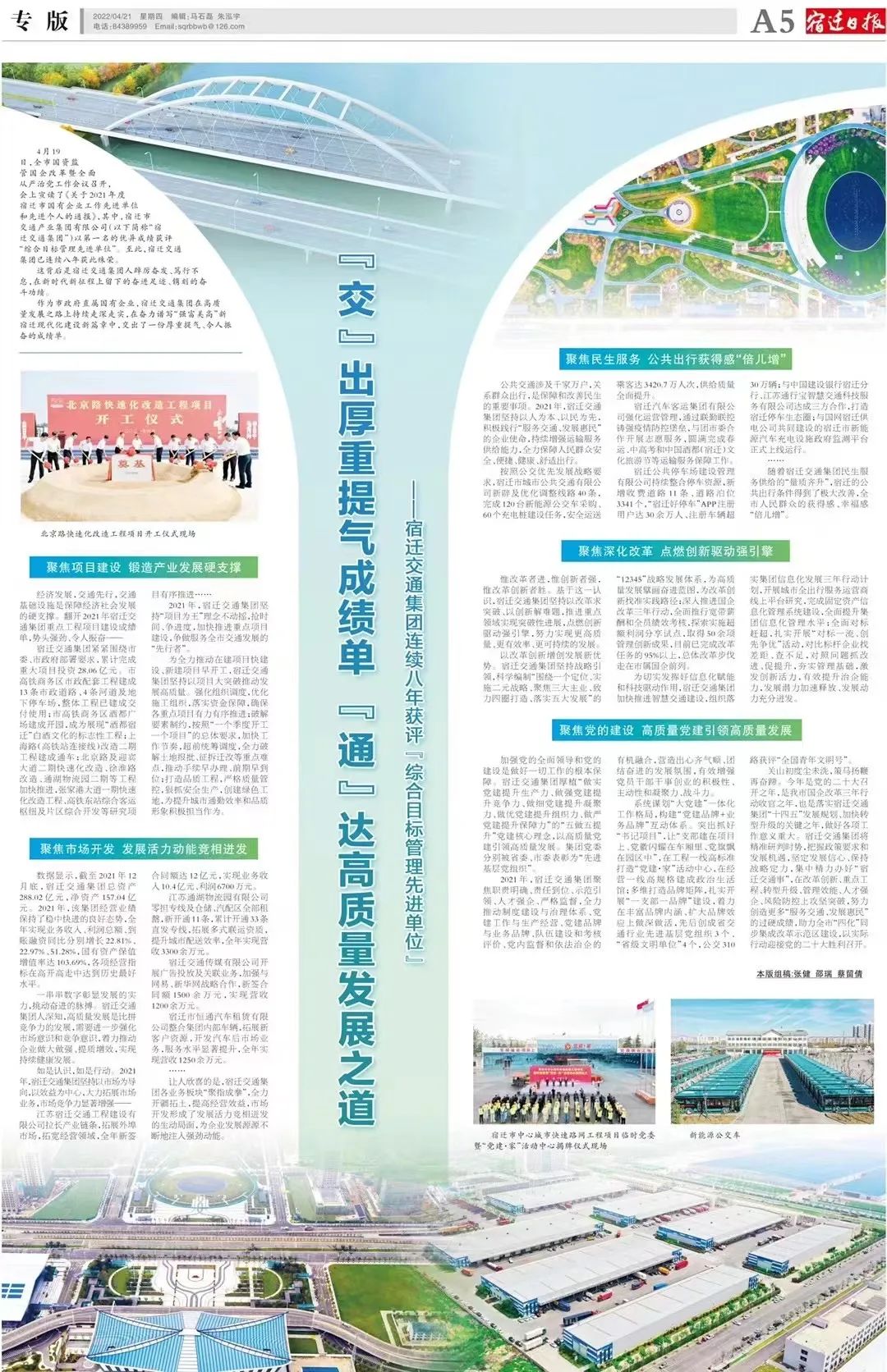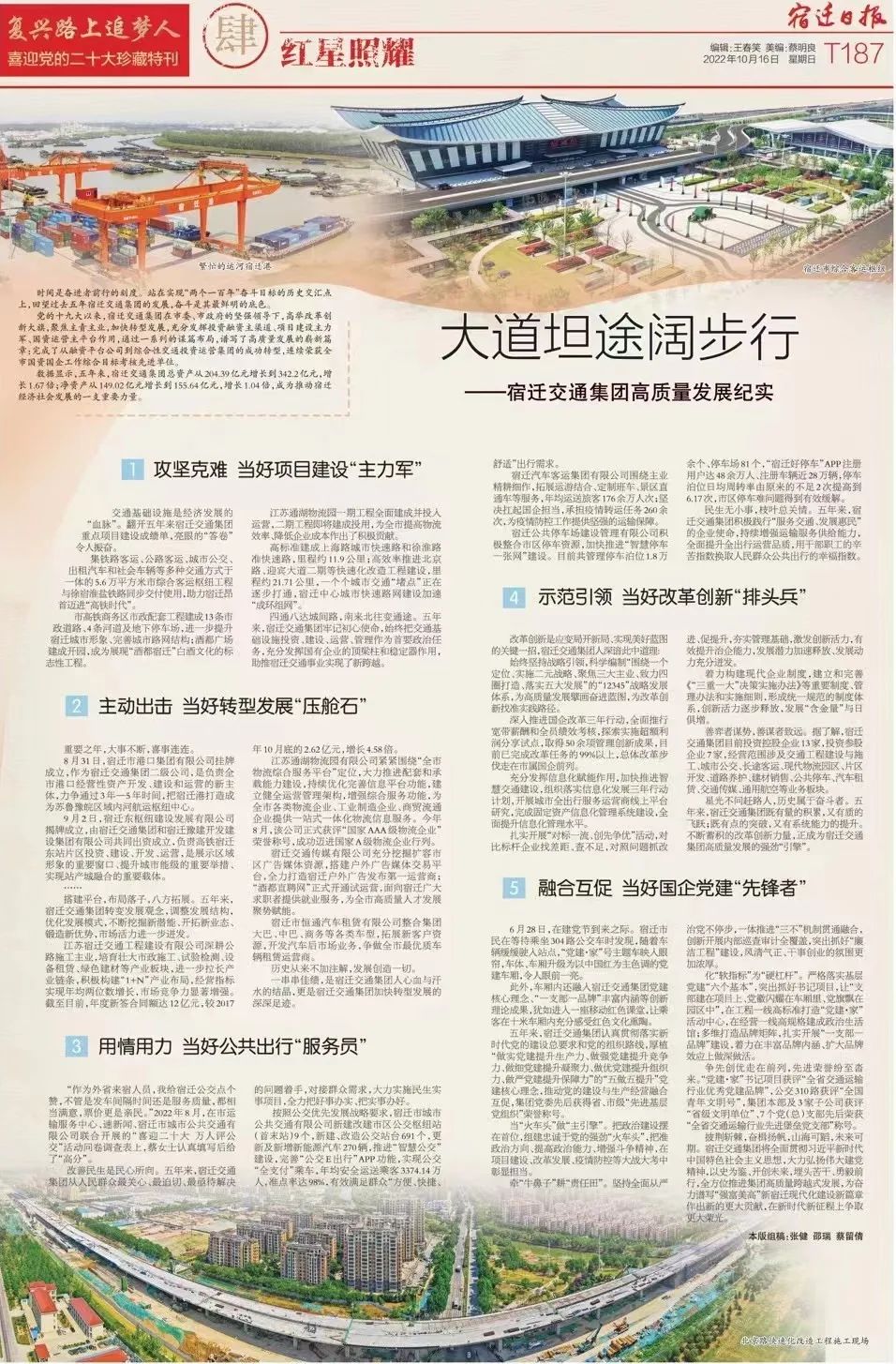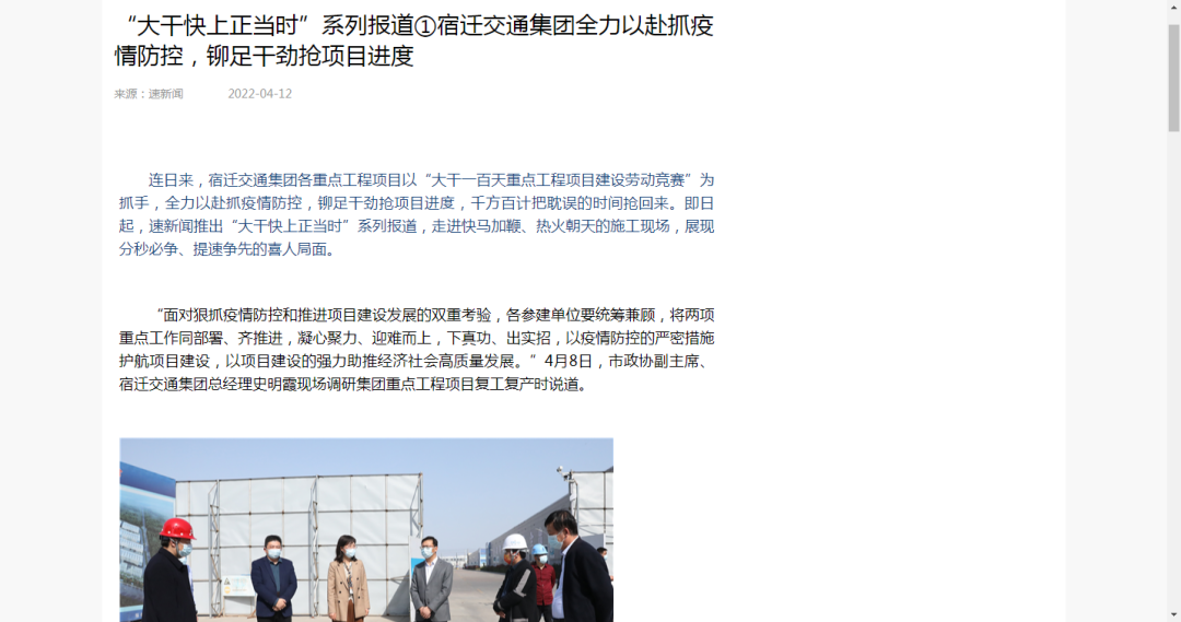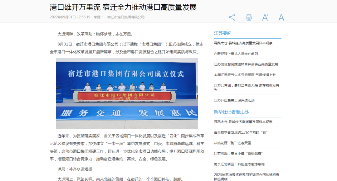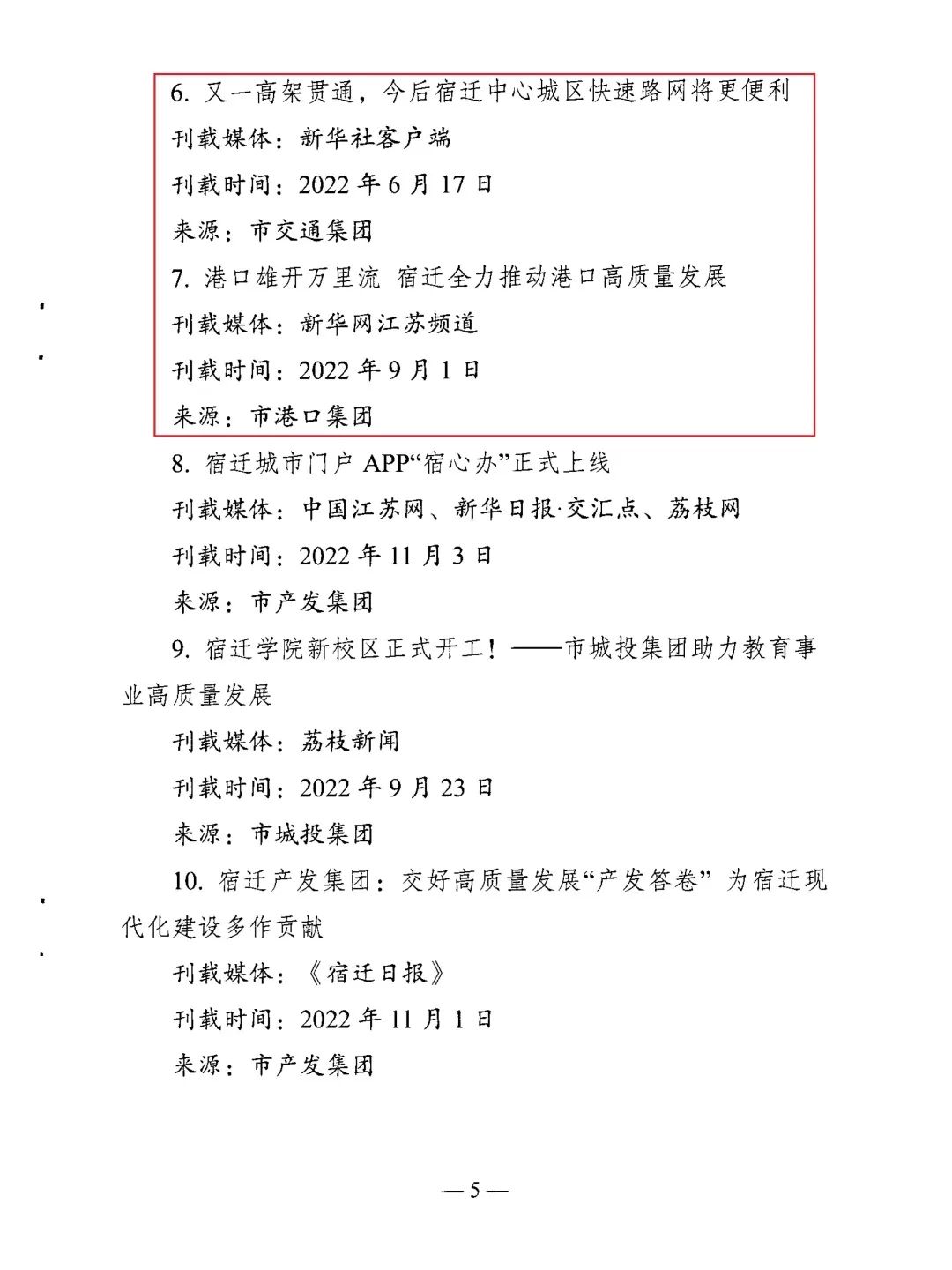 ❖聚焦重点工作报道。围绕重大事项开展专项宣传,充分发挥全媒体平台作用,形成宣传声势。比如,围绕北京路建成通车,新华社、省委新闻网、交汇点等媒体先后报道;围绕港口集团组建,新华网、速新闻、宿迁手机台等媒体先后报道,得到了省、市国资委关注。
