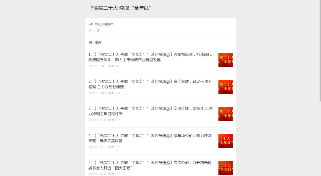 ❖聚焦重大主题宣传。以学习宣传贯彻党的二十大精神为主线,在网站、公众号设立专栏,推出“贯彻二十大精神 推动高质量发展”“落实二十大 夺取‘全年红’”系列报道,全面展现党的二十大精神在集团落地生根、开花结果的有力举措。