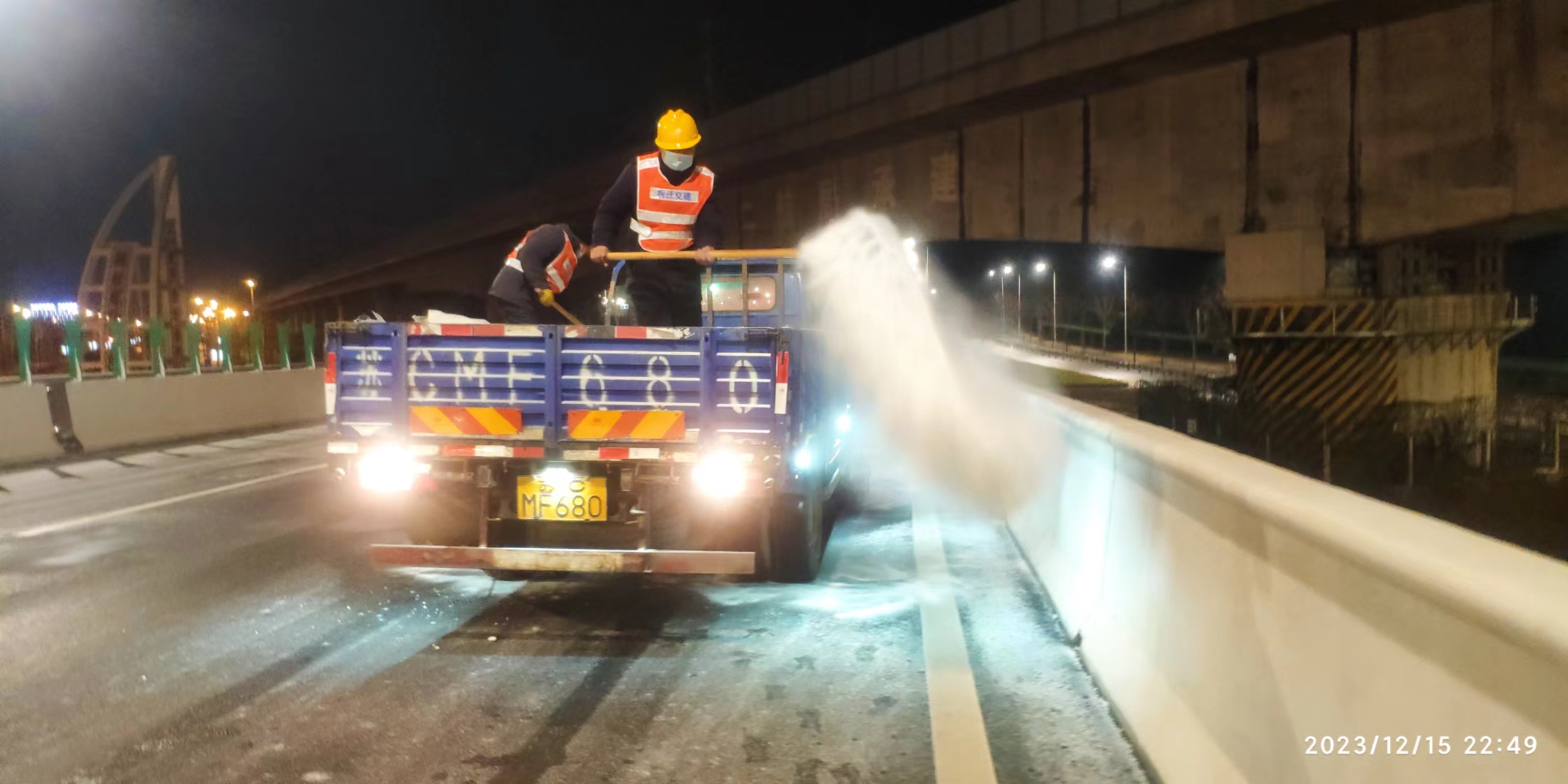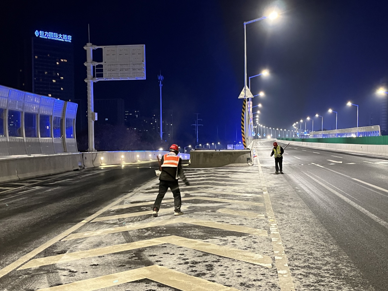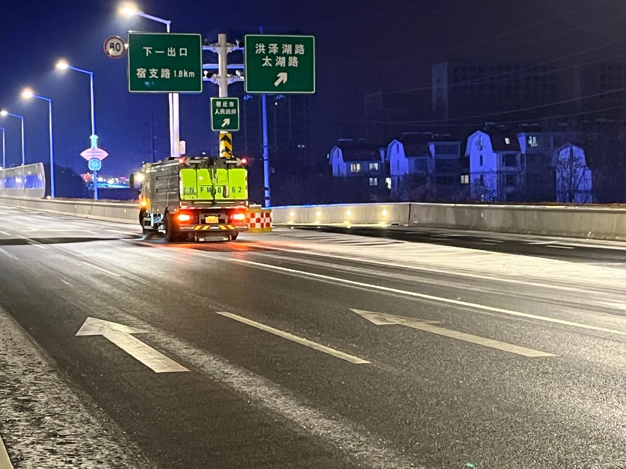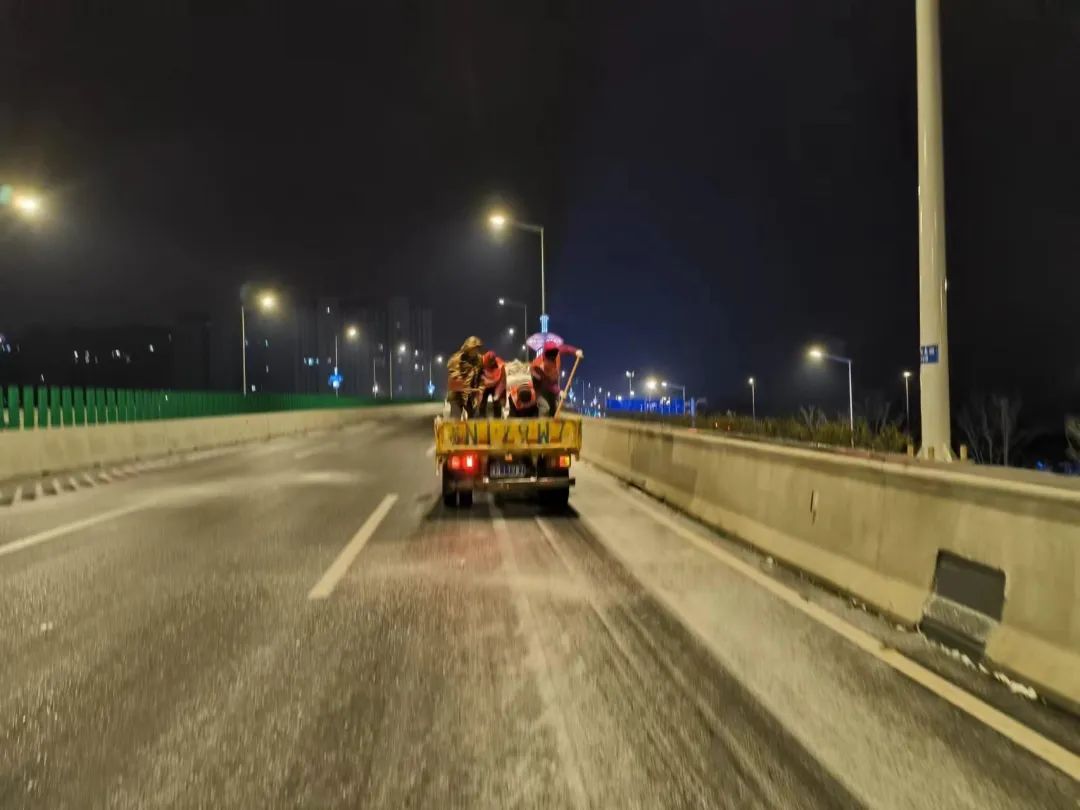 高铁公司立即启动应急预案,组织养护单位迅速至北京路、迎宾大道二期、洋河大道、上海路等路段开展融雪除冰工作;同时,联合市公安局铁骑大队互动巡查,确保道路安全畅通。宿迁交建道路养护党员突击队第一时间上路,通过撒布融雪剂、融雪盐和摆放防滑料,及时破除清扫结冰、积雪路段。