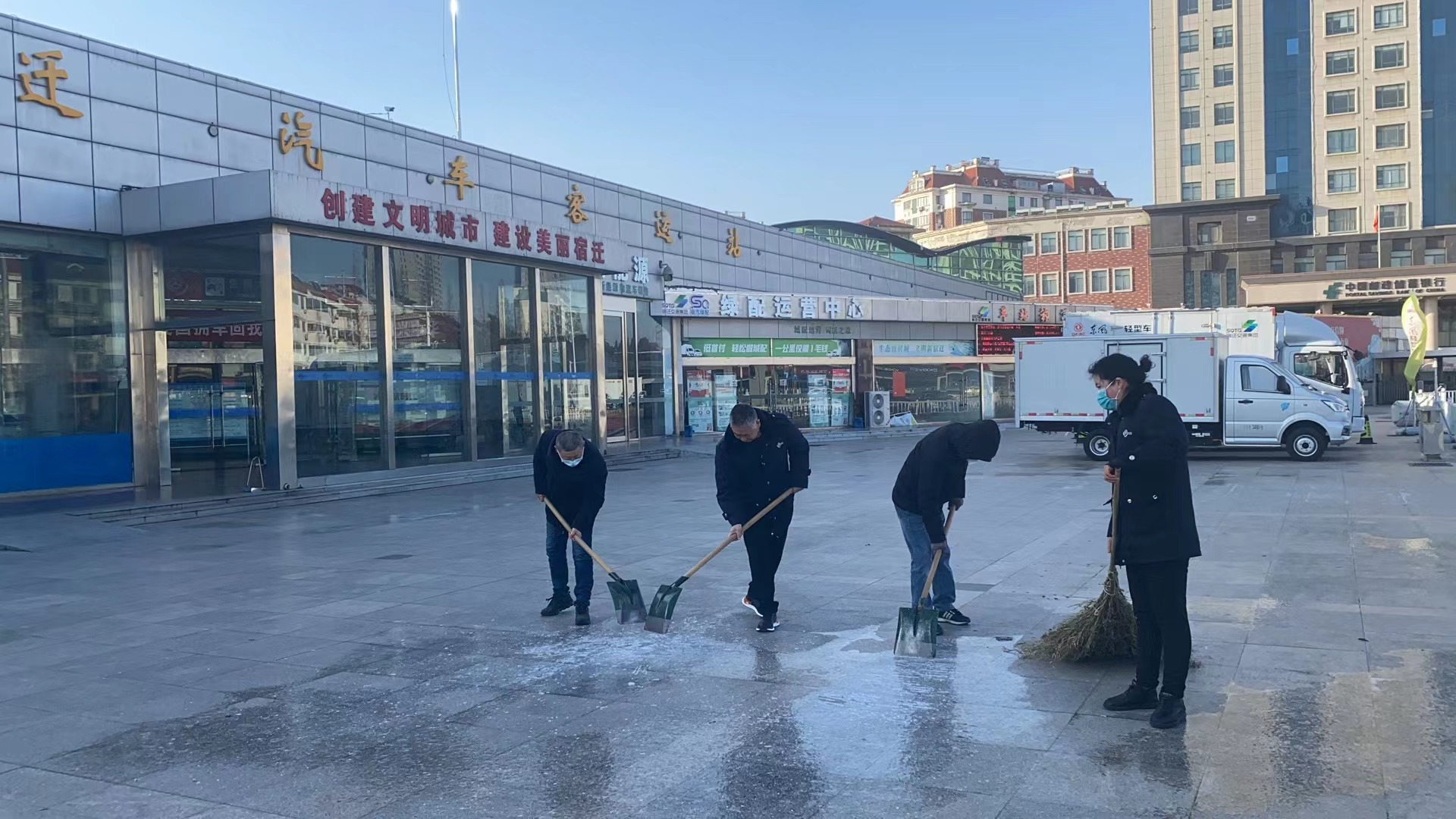 宿迁汽车客运站本着“提前预防、快速反应、果断处置”的原则,组织站务人员开展站前广场除冰融雪,重点清扫广场积雪成冰地段,防止旅客摔倒、滑倒;安排专人提前开展路面监控,排查车辆通行困难路段,强化车辆状态实时监控,对驾驶员进行安全提醒,全力保障旅客出行安全。