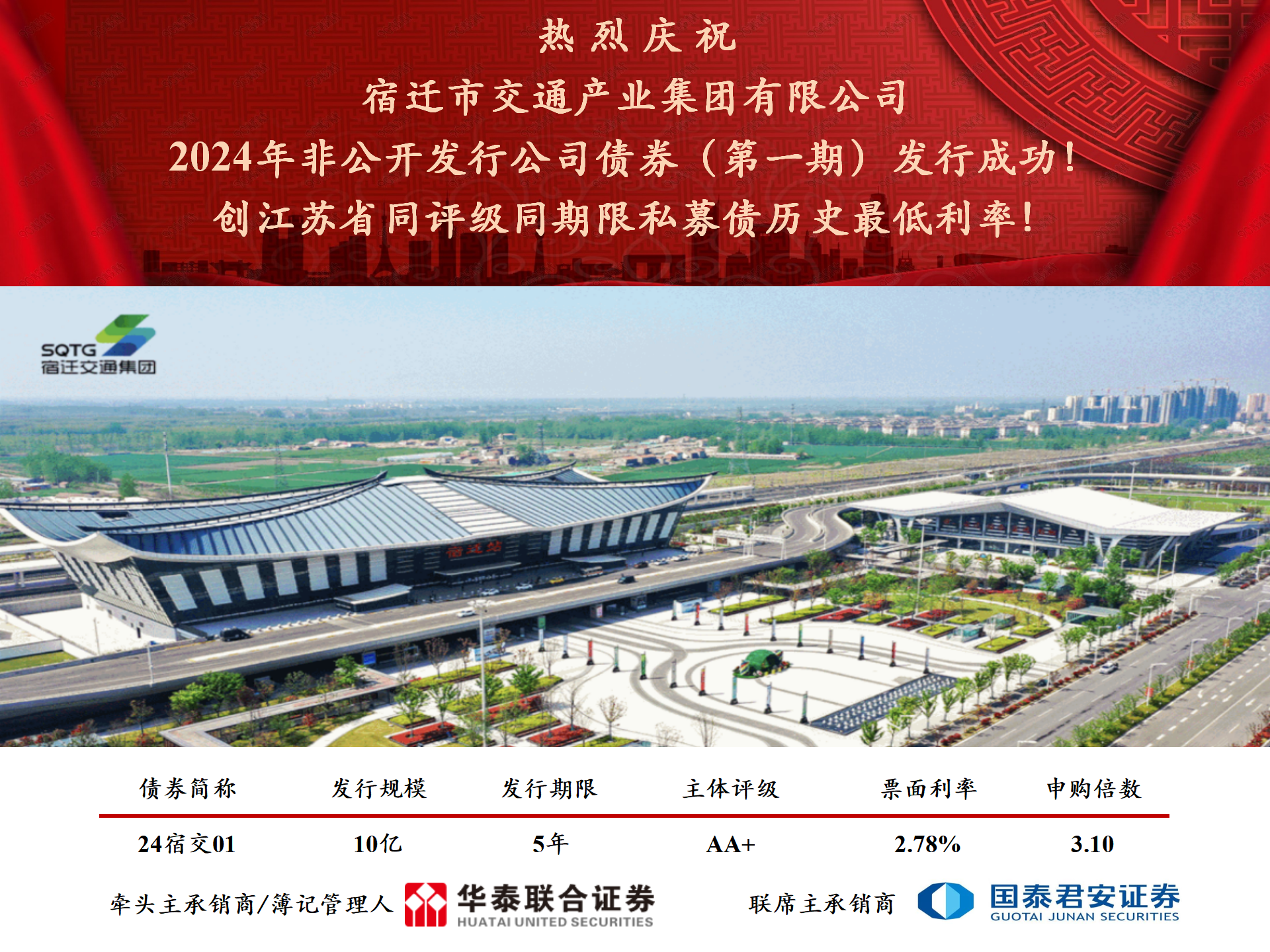 宿迁交通集团2024年新发债券利率创全省历史新低!