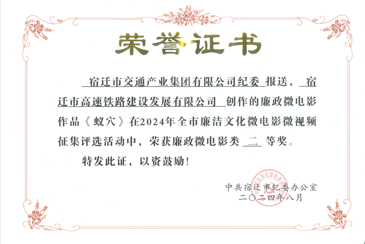 为深入贯彻落实中央纪委三次全会精神,以光影艺术弘扬廉洁文化,突出廉洁文化在一体推进“三不腐”中的重要作用,近日,宿迁交通集团纪委制作打造的廉政微电影《蚁穴》,在全市56部廉政微电影作品中脱颖而出,荣获2024年全市廉政微电影二等奖,并将在“宿迁廉风”网站、微信公众号和速新闻、宿迁电视台、宿迁手机台等媒体平台进行展播。