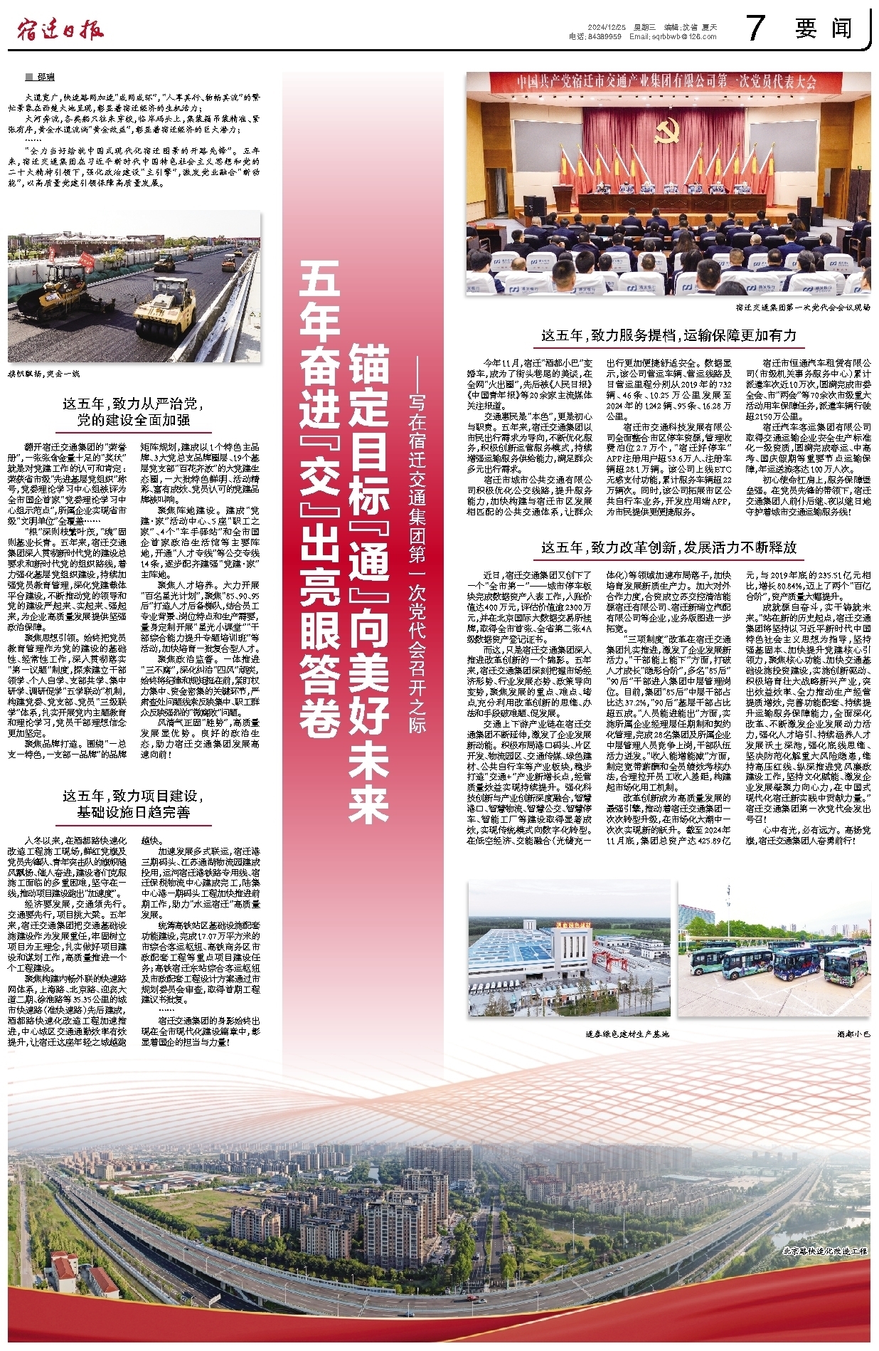 成就源自奋斗,实干铸就未来。“站在新的历史起点,宿迁交通集团将坚持以习近平新时代中国特色社会主义思想为指导,坚持强基固本、加快提升党建核心引领力,聚焦核心功能、加快交通基础设施投资建设,实施创新驱动、积极培育壮大战略新兴产业,突出效益效率、全力推动生产经营提质增效,完善功能配套、持续提升运输服务保障能力,全面深化改革、不断激发企业发展动力活力,强化人才培引、持续涵养人才发展沃土深池,强化底线思维、坚决防范化解重大风险隐患,维持高压红线、纵深推进党风廉政建设工作,坚持文化赋能、激发企业发展凝聚力向心力,在中国式现代化宿迁新实践中贡献力量。”宿迁交通集团第一次党代会发出号召!