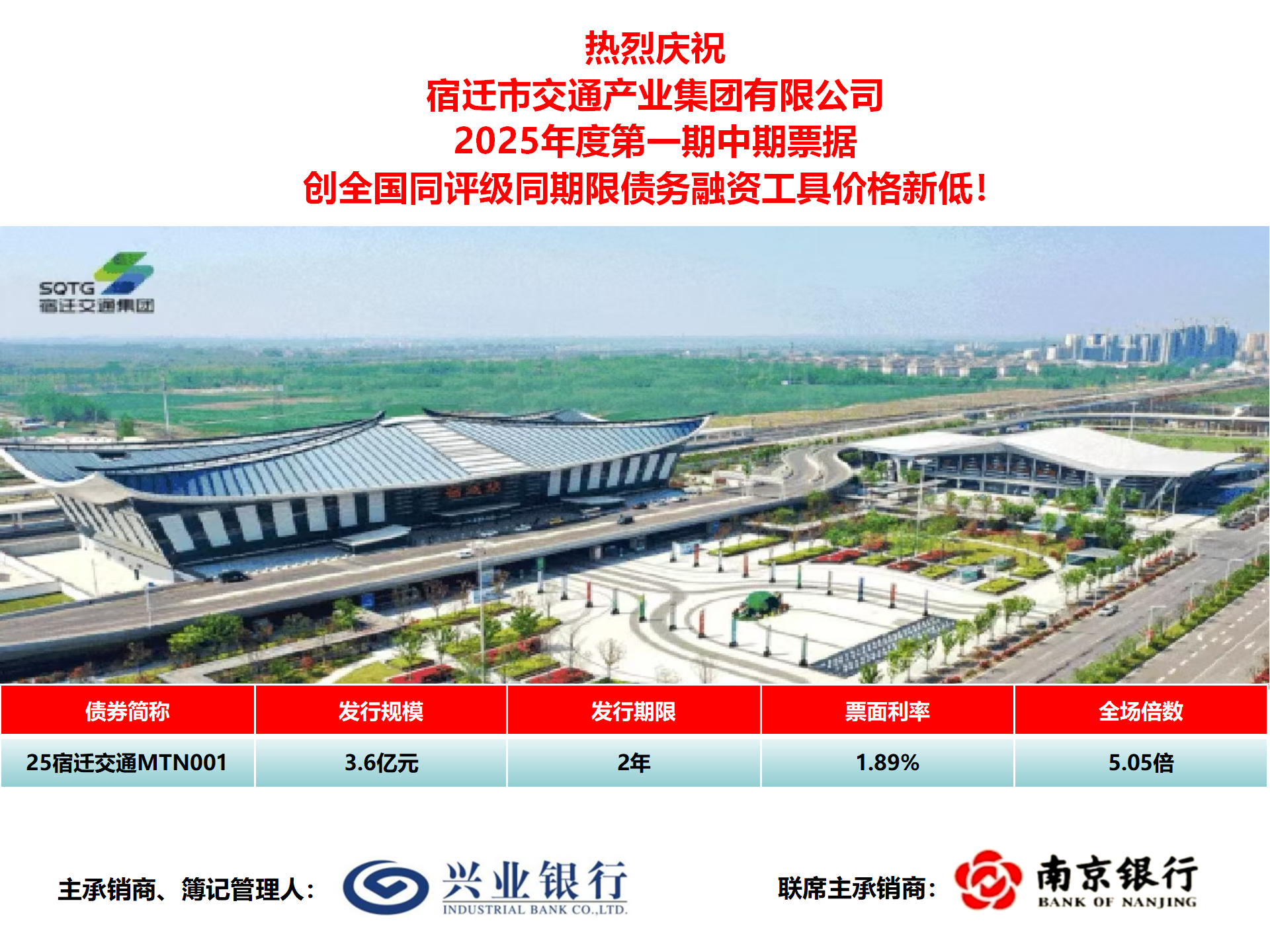 开门红!宿迁交通集团2025年第一期中期票据发行,利率创全国同评级同期限最低