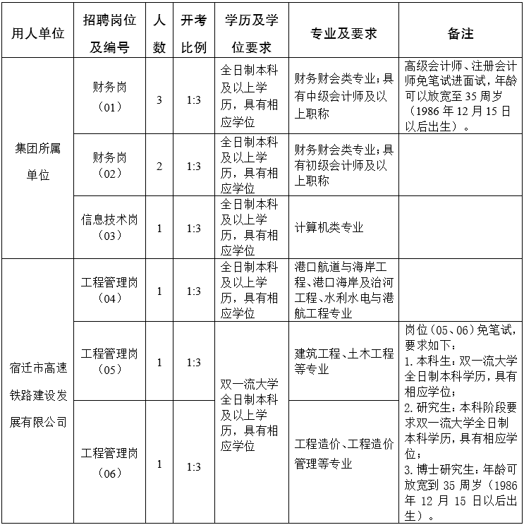 招聘岗位(01-04)报考人员通过资格初审后参加笔试。笔试时间、地点及成绩将在市交通集团官网上进行公布。报名成功的考生登录原报名网站打印准考证。笔试内容为岗位专业知识和技能,不指定辅导用书。工程管理岗(05、06)免笔试。