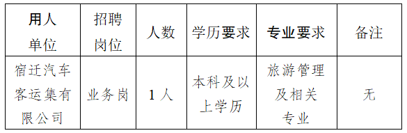 宿迁汽车客运集团有限公司是宿迁交通集团下属国有子公司,注册资本8000万元,从事客运、旅游等多种业务。现因公司发展需要,向社会公开招聘旅游业务工作人员。