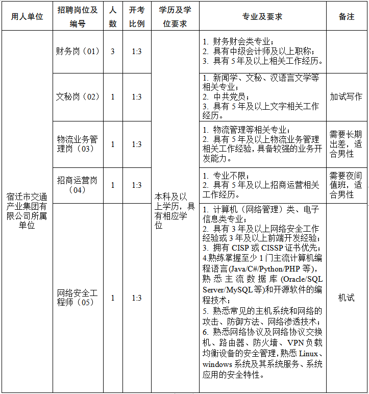 招聘岗位(01-04)报考人员通过资格初审后参加笔试,招聘岗位(05)报考人员通过资格初审后参加机试。测试时间、地点及成绩将在宿迁交通集团官网上进行公布。报名成功的考生登录原报名网站打印准考证。测试内容为岗位专业知识和技能,不指定辅导用书。测试合格线为60分,未达测试合格分数线的,取消进入下一环节资格。