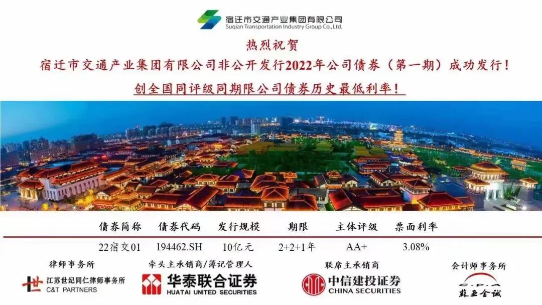 近日,集团成功发行第一期非公开发行2022年公司债券,发行规模10亿元,期限2+2+1年,由华泰联合证券、中信建投证券联合承销,票面利率3.08%,创全国同评级同期限公司债券历史最低利率。