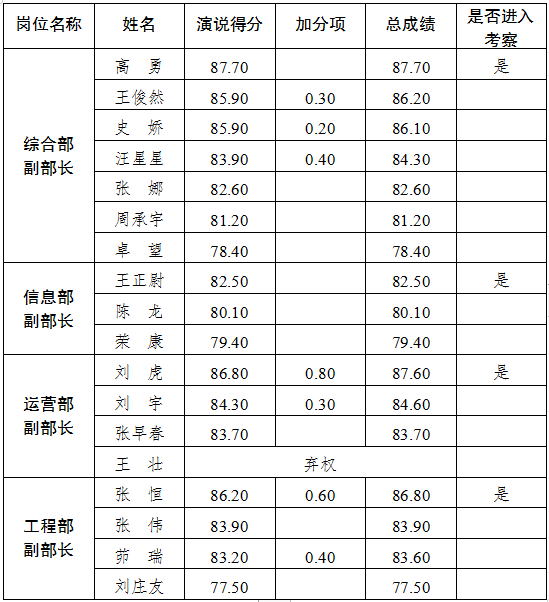根据《宿迁交通集团所属单位2022年度中层管理人员竞聘实施方案》的安排,竞聘演说工作已经结束,现将竞聘总成绩及进入组织考察人员名单公布如下。